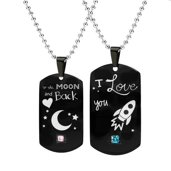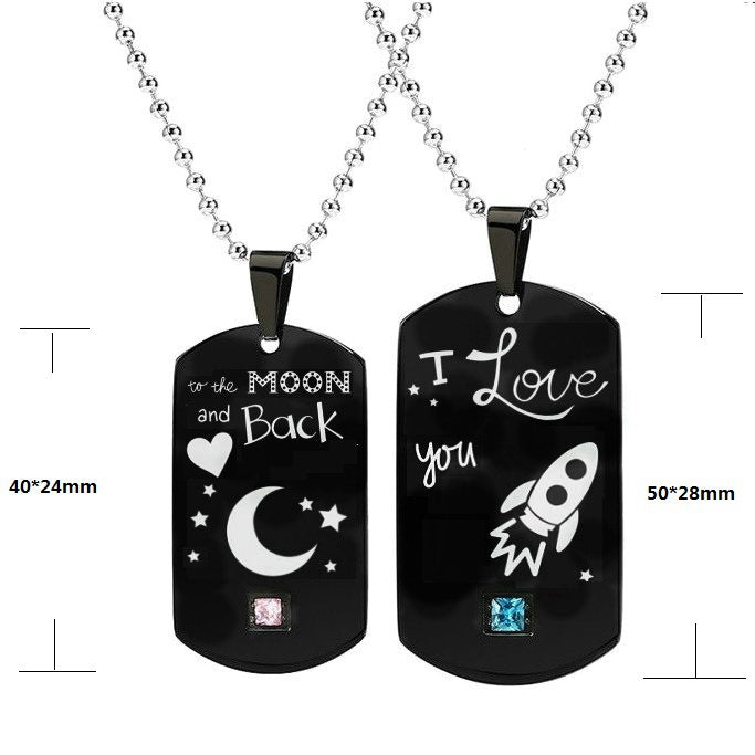 Heartbeat & Heart Shape Rocket Moon Couple Necklaces Black Titanium Steel DIY Engrave Tag Stone Pendant Necklace