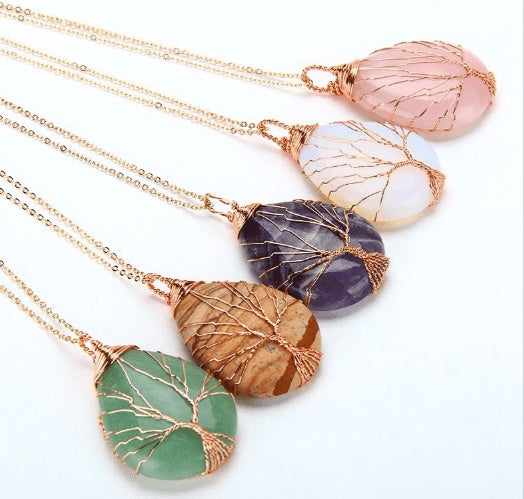 Natural Quartz Opal Stone Pendants Handmade Rose Gold Color Handmade Tree of Life Wrapped Drop Shaped Crystal Pendant Necklace